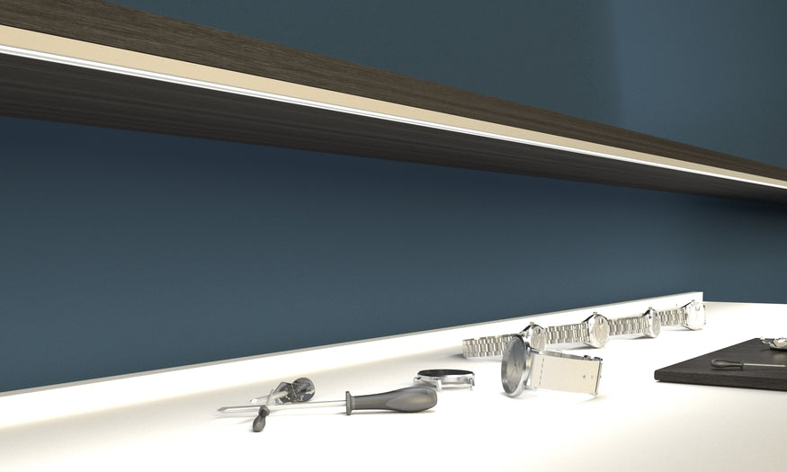 Du kan få snygg och effektiv LED-belysning till ditt skrivbord genom att använda antingen en utanpåliggande eller infälld profil och en effektiv LED-list. Ljusstyrning är enkel med trådlösa styrenheter .