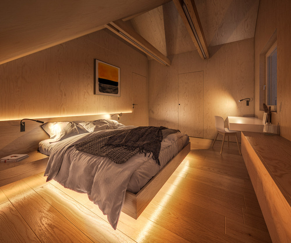 Installed under the bed LED-ribbon lighting creates a mood and can be used as a night-time light. We recommend a low-power LED-strip lighting. You can also illuminate a bedside table with the same light. LED-with the same strip!