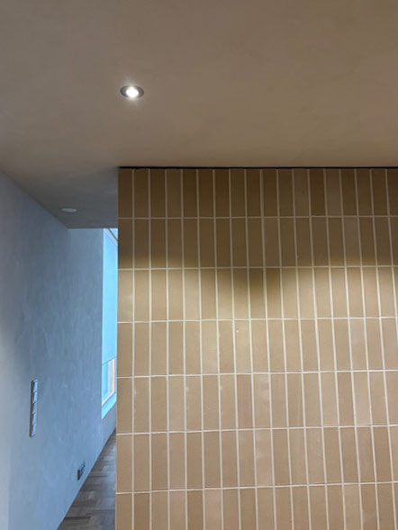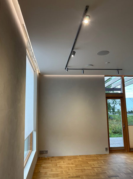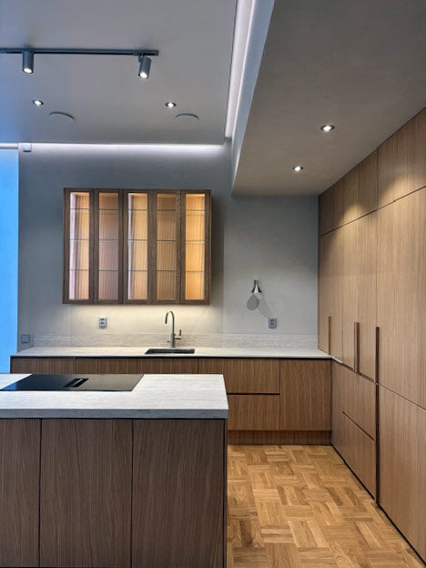 I det här hemmet kombinerar belysningslösningarna dämpat indirekt ljus med exakt riktade armaturer som framhäver materialens skönhet och de arkitektoniska detaljerna. I vardagsrummet skapar skenor och en LED-list längs taket ett mjukt, jämnt allmänljus som kan riktas efter behov. I köket ger infällda downlights ljus arbetsbelysning, medan belysningen av mellanutrymmet och vitrinskåpen ger värme och visuellt djup. Detaljer, som den kaklade väggen, framhävs också med spotlights, vilket bidrar till utrymmets arkitektoniska utseende.