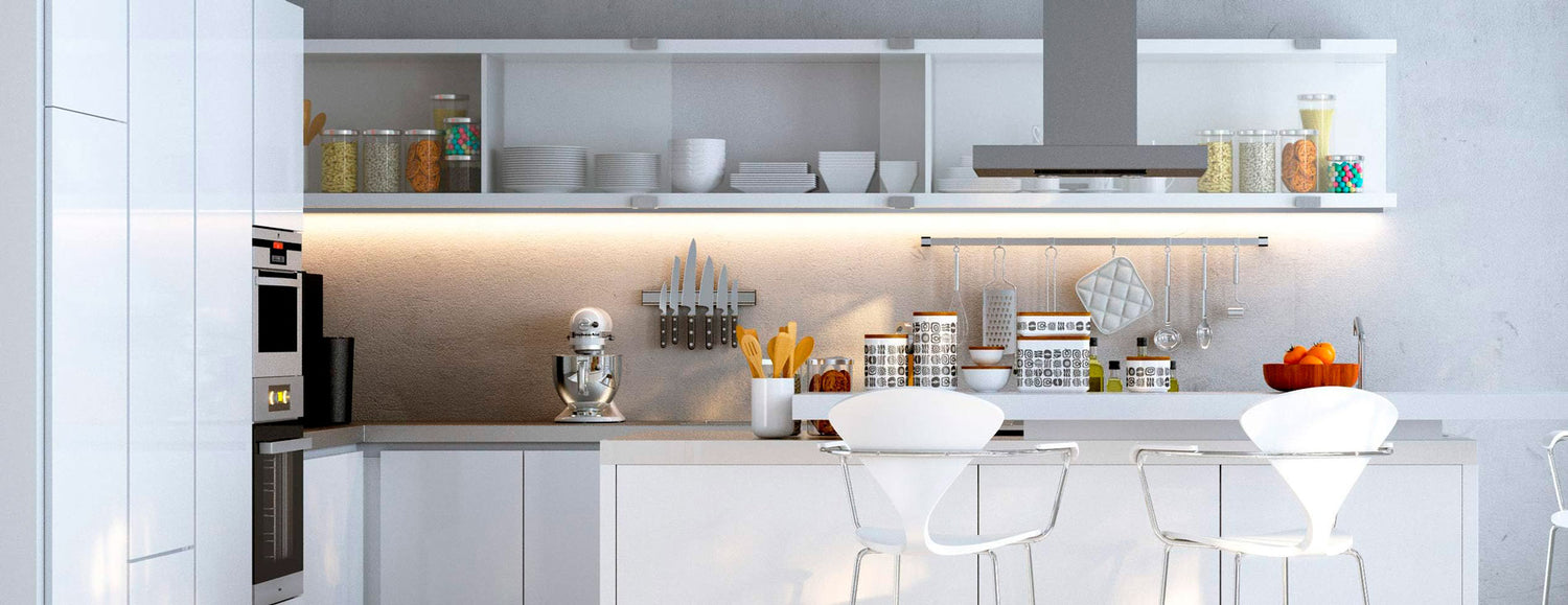 In the kitchen, for example, aluminium profile inset lights are a good choice. LED-strips, which provide even light on the kitchen worktops and cabinet doors. In addition to kitchen lighting LED-strips are also suitable for accent wall lighting in living rooms or hallways, for example.
