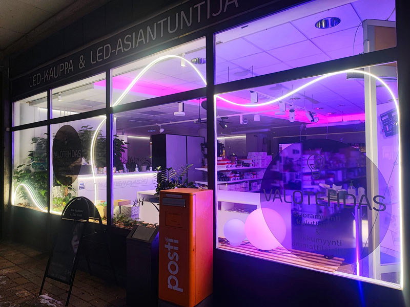 Våra nuvarande lokaler finns i Ajurintie, Nummela – 1100 m² stora lokaler, där vi samarbetar med Lumisolutions, ett företag specialiserat på projektbelysning. Vi levererar LED-produkter dagligen över hela Finland.