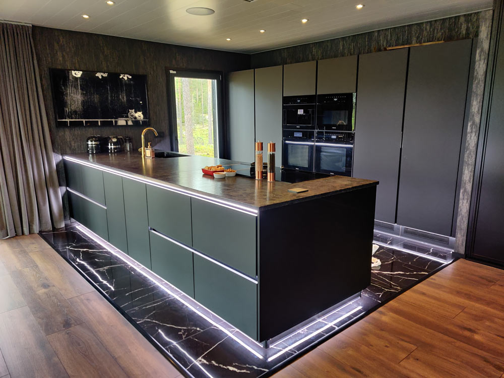 We also offer custom-made service kitchen LED-lighting, which means that the luminaires are delivered to you ready to use, complete with wiring, and easy to install in your kitchen. We are also happy to help you with the positioning of your luminaires and the design of your lighting solutions. We welcome you to visit our kitchen LED-kitchen lighting range!