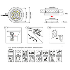 Den snygga 2W LED-skåpslampan OVAL i borstat stål erbjuder en effektiv belysningslösning för kök, vitrinskåp, garderober och andra utrymmen i hemmet. Dess moderna design och enkla installation gör den till ett utmärkt val för både konsumenter och proffs. Helt platt, fläckfri ljusbild och mycket låg modell, med 2 m anslutningskabel och PLUG IN-kontakt. Lämplig för både infälld montering i ett 58 mm monteringshål och utanpåliggande montering på skåpets undersida. Avtagbar utanpåliggande monteringsring, dvs. mycket låg installation vid infälld montering och endast 14 mm med utanpåliggande monteringsring. För installation finns en praktisk PLUG IN-snabbkopplingsbox för sex lampor . Naturligtvis kan du också klippa av lampkablarna och ansluta + och - kablarna direkt till transformatorns + och - poler, men för större mängder lampor är en snabbkopplingsbox praktisk.