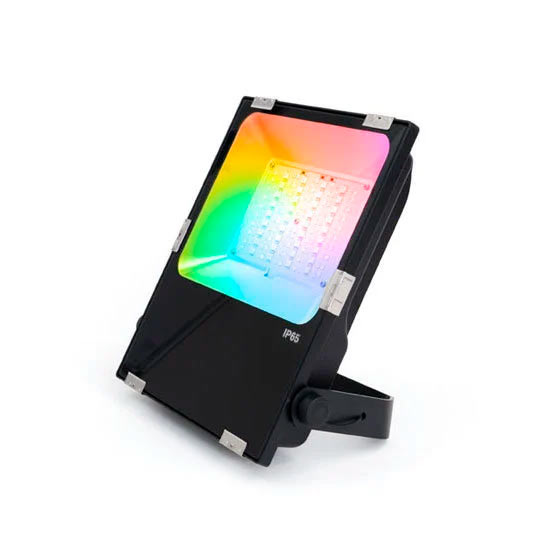 Multicoloured and tunable white 50W LED-spotlight Smart LED 2.4G series with a light output of 3500-4200lm. The luminaire has both cct-colour temperature adjustable LEDs, and rgb multi-colour LEDs, which allow for easy implementation of a wide range of lighting options, both in terms of light colour and dimming. The IP65 protection makes it suitable for indoor and outdoor use in damp environments. The range from controller to spotlight is 30m, followed by a maximum distance between subsequent spotlights. 30m intervals.