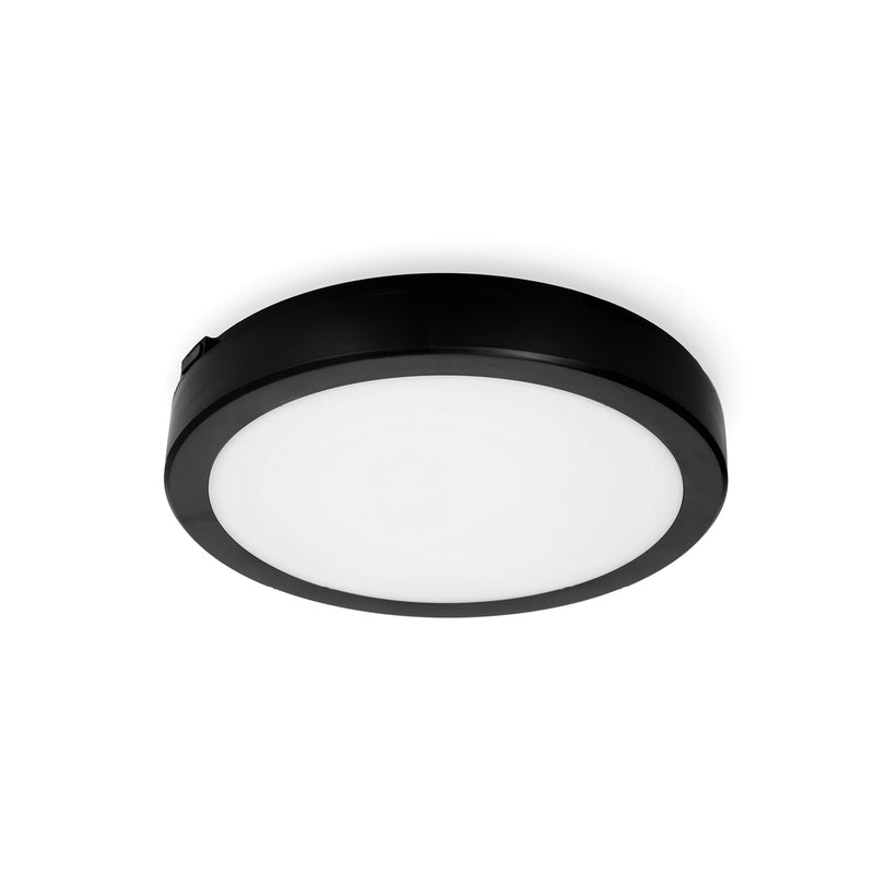 Svart, enkel rund 18W LED-taklampa med IP65/IK08-skydd för badrum, toaletter och utomhusbruk. Ljusfärg kan väljas med en strömbrytare på lampans baksida - 3000K varmvitt, 4000K neutralvitt eller 6500K kallvitt ljus. LED-lampan ger ett jämnt, effektivt och bländfritt vitt ljus och en ljusstyrka på 1710 lm. Ej dimbar.