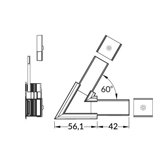 LINJA-UPPO20 LED-60° corner piece of the profile. With the corner pieces the profile is easy to install, they stiffen the profile and there is no need to cut the LED profile into a straight line. In the middle, a clear stiffening piece of diffuser, through which light can also pass at an angle. The side length of the corner piece is 5,61cm in each direction.