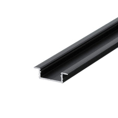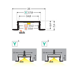 Infälld bred 25 mm x 7,4 mm LED-aluminiumremsa för max. 14 mm bred LED-remsa, installation i möbler, vägg eller tak. Tre färgalternativ - anodiserad, svart och vit, listlängd 2000 mm. Finns i flera olika lockalternativ med både glidande B-diffusor och påklistrad C3-diffusor. , ändstycken och flera olika fästelement.