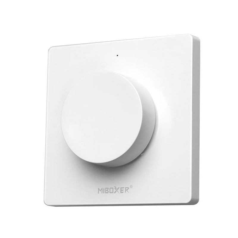 Low cost white wireless surface mount LED-roll dimmer for monochrome 12-24V LED-and 12-24V ribbons LEDand 12-24V lamps and 12-24V tunable white CCT LED-and 230V TRIAC dimmable bulbs, LED-strips and LED-lamps.