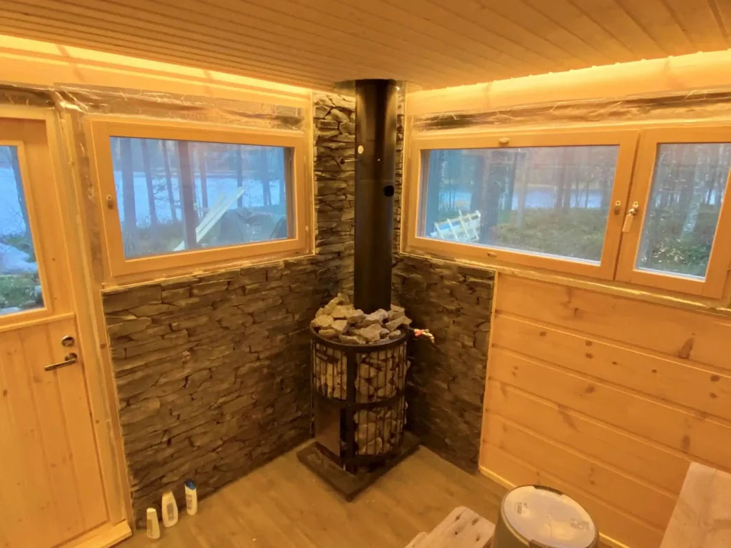 Saarimökin saunatuvan ja saunan epäsuoravalaistus rakenteilla. Lue koko rakennuskirjoitus Saarirakentamista-blogista.