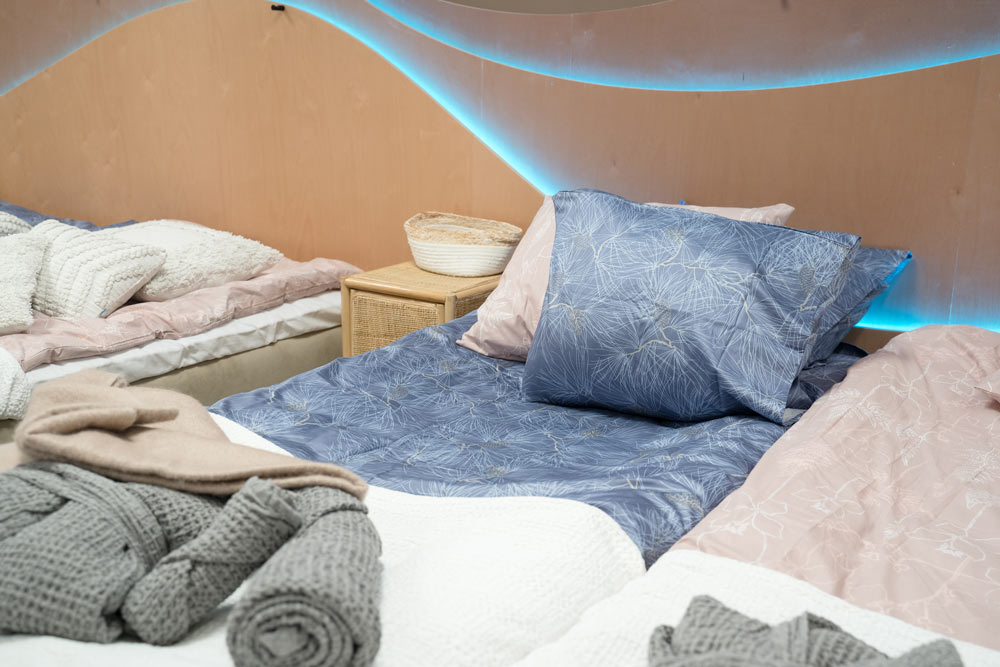 BB-fanit laskevat jo sänkyjä, vetäessään johtopäätöksiä talosta puuttuvien asukkaiden lukumäärästä. Tivolimainen väritys toistuu myös makuuhuoneessa, ja LED-lamput riippuvat siskonpedin yllä. Parvisängyn alle jää sopivasti jälleen yksi paikka taktikointipalavereille.
