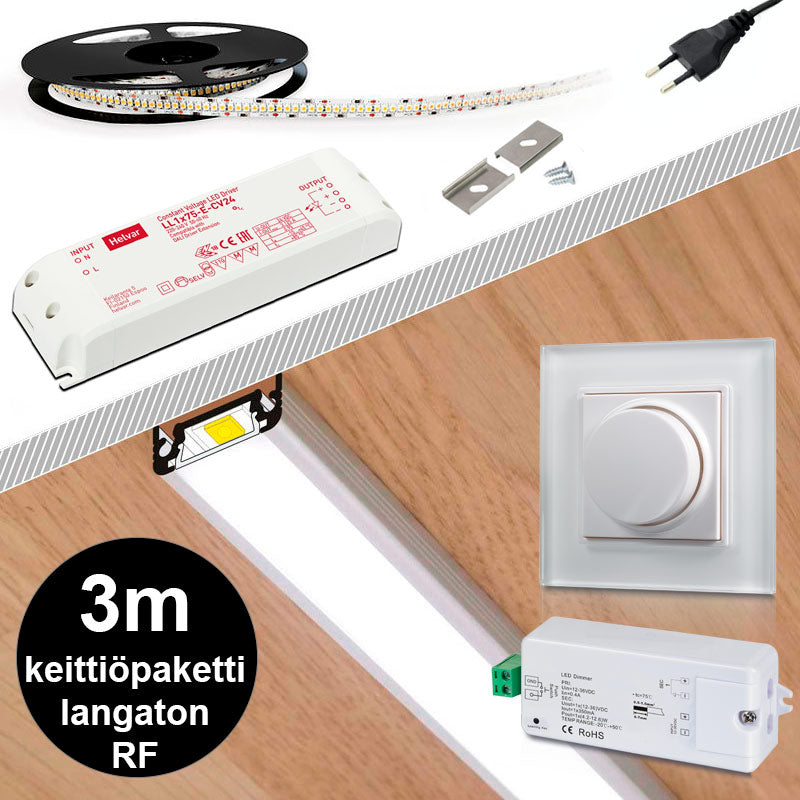 3m keittiöpaketti RF - sis. PINTA14 LED-profiili 3m, 12,5W/m 24V LED-nauha 3m, LED-muuntaja ja langaton himmennyssetti