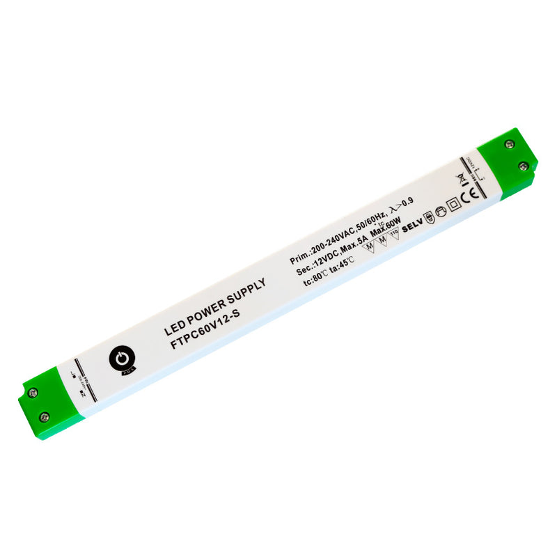 60W 12V SLIM LED muuntaja eli vakiojänniteteholähde LED-valoille. Sisäkäyttöön soveltuva laadukas LED muuntaja, IP20. Soveltuu kaikille 12V LED nauhoillemme. Hyvät suojaukset ja 3 vuoden takuu.