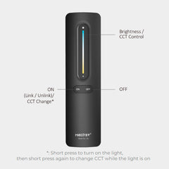 Helppokäyttöinen ja selkeä! ON ja OFF napit valojen ohjaukseen ja liukusäätimellä saat säädettyä valon kirkkautta. Jos haluat säätää värilämpötilaa niin paina valojen jo päällä ollessa uudelleen ON-nappia ja liukukytkimellä voi nyt säätää värilämpötilaa. Katso käyttöohje täältä. Mukana magneettinen taustalevy jolla saat kiinnitettyä kaukosäätimen haluamaasi paikkaan seinälle.