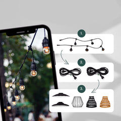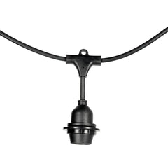 Valoketjun suojausluokka on IP44 eli valoketju soveltuu myös ulkotiloissa käytettäväksi. Valoketjua pystyy jatkamaan mukana tulevilla IP-suojatuilla liittimillä max. 500W asti, eli voit asentaa useampia valoketjuja kiinni toisiinsa. Jokaisen polttimon kiinnikkeen kohdalla on kiinnityslenkki ruuvia tai vaikkapa nippusidettä varten ja erikseen myytävällä 5m tai 10m pistotulppajohdolla saa kätevästi 230V virran valosarjaan pitkänkin matkan päästä.
