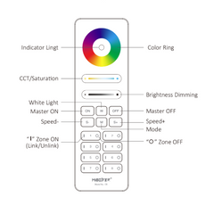 Värejä säädetään väripyörällä ja himmennystä liukukytkimellä. Voit säätää värilämpötilaa eli kelvineitä myös liukukytkimellä. Modet eli erilaiset vaihtuvat väritilat saat päälle M-napista ja niiden vauhtia voit säätää myös S- / S+ napeista. Kun kosketat taas väripyörää ja valitset jonkun värin, saat säädettyä saturaatiota CCT-liukukytkimellä. Jos painat Master ON nappia niin säädät kaikkia kaukosäätimeen asennettuja kanavia yhtä aikaa. Jos painat esimerkiksi 1 kanavaa päälle niin sen jälkeen säädöt vaikuttavat vain kyseisen kanavan valoihin.