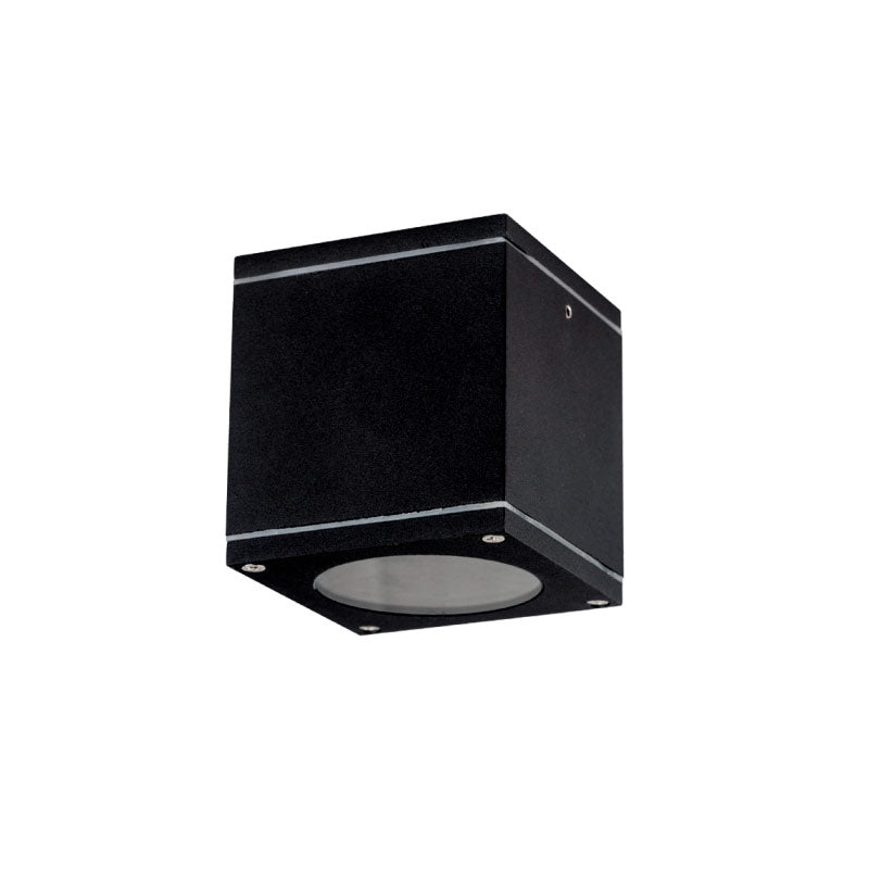 Kulmikas, neliön mallinen mustan värinen alasvalo ulkokäyttöön GU10 kannalla. Kestävä alumiinirunko ja IP44 luokitus.