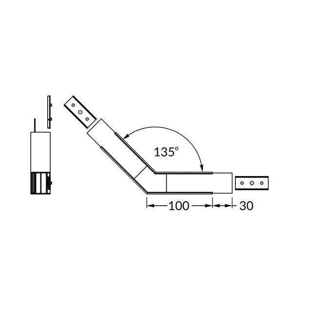 MONI30-02 LED-profiilin 135° kulmapala. Kulmapaloilla profiilin asennus on helppoa, ne jäykistävät profiilin eikä led-profiilia tarvitse leikata jiiriin. Keskellä kirkas jäykistävä pala diffuusoria, jonka läpi valo pääsee myös kulmassa. Kulmapalan sivupituus 10cm kumpaankin suuntaan.