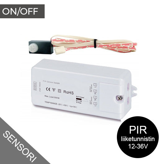 12-36V kytkettävä infrapuna PIR liiketunnistin, jota käytetään kun halutaan valojen syttyvän ja sammuvan liiketunnistimen avulla valonkatkaisijan sijasta. Voidaan asentaa esimerkiksi portaisiin kytkemään valot päälle kun portaissa kuljetaan. Ei himmennystä, vain on/off-toiminto. Tähän voi liittää suoraan esim. 12V ja 24V muuntajat.