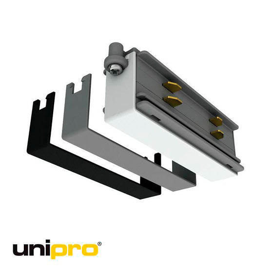Jatkokappale Unipro 3-vaihekiskoille. Mukana valkoinen, musta ja harmaa kansi, joten saat siistin asennuksen kaikenvärisiin Unipro kiskoihin.