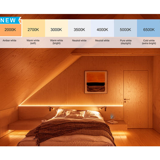 Färgtemperaturerna på LED-lampor i ditt hem påverkar hur ljuset ser ut och vilken stämning det skapar. 2700K mycket varmvitt, 3000K varmvitt, 4000K neutralvitt och 5700K kallvitt är vanliga individuella färgtemperaturer som används i LED-lampor. LED-lampor med justerbar färgtemperatur ger möjlighet att fritt justera färgtemperaturen och ljusets dimningsnivå efter dina behov och skapa exakt den önskade stämningen eller känslan.