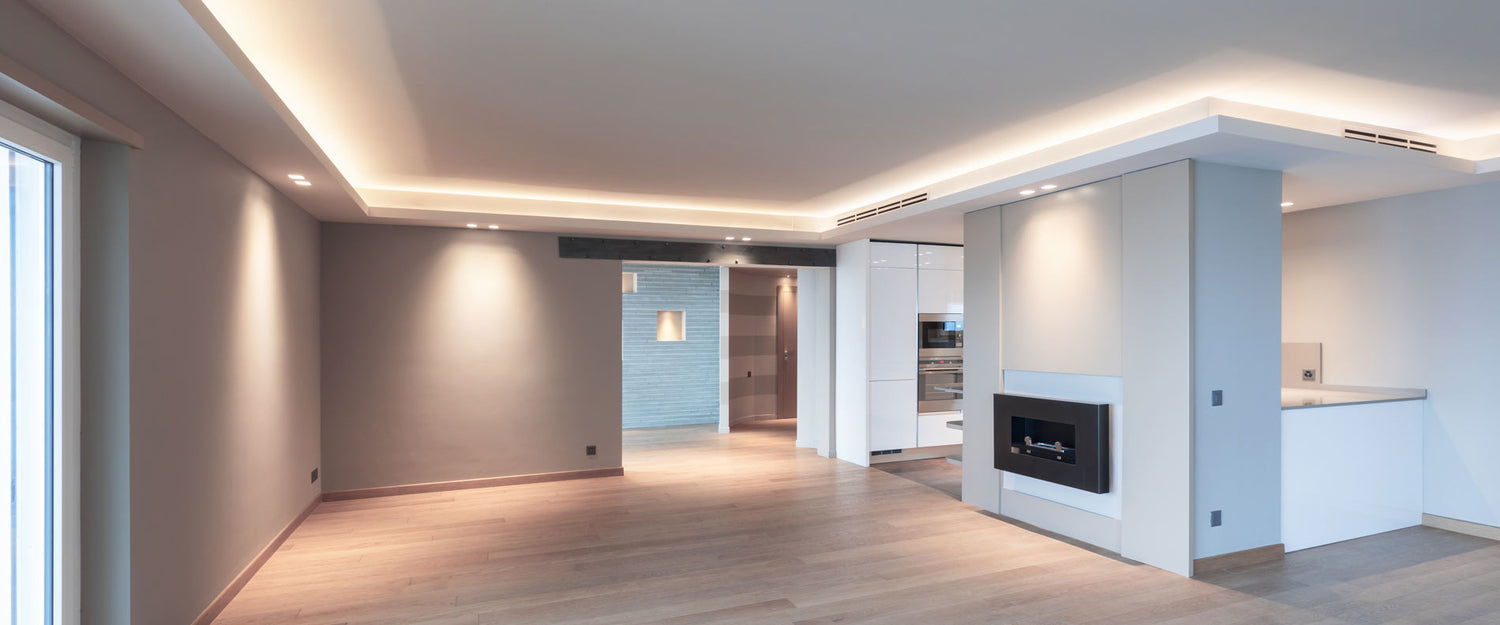 När platsen har bestämts överväger vi hur belysningen ska utföras och var transformatorerna ska placeras. Lämpliga LED-remsor beror delvis på ditt projekt – vi rekommenderar generellt att använda 24V LED-remsor , eftersom spänningsfallet i dem över ett avstånd på flera meter inte är lika stort som i 12V-remsor, vilket innebär att ljuset förblir lika starkt över ett avstånd på cirka 5 m. När projektet planeras i förväg och du har produkter designade för indirekt belysning kan installationen slutföras på bara några timmar!