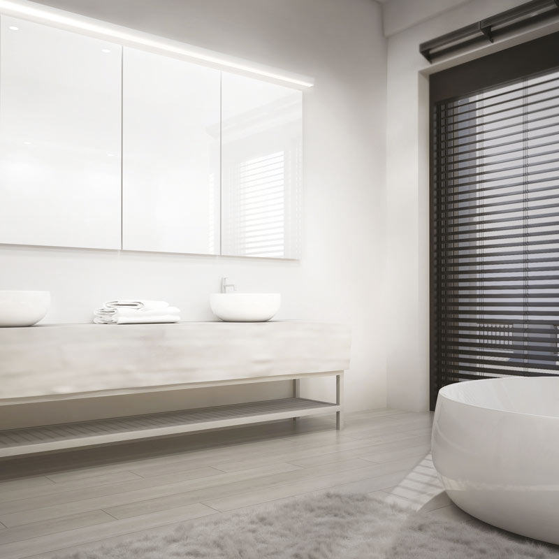 Ett bra val för stämningsbelysning i badrummet är till exempel en 9,6 W LED-list i antingen 3000 K eller 4000 K, som kan inkapslas i infällda takprofiler som KEHYS14 , som går runt taket eller MINI-UPPO10 , eller monteras som en utanpåliggande profil efter eget val, t.ex. MINI10 eller SUORA12 . Indirekt belysning infälld i taklisten har blivit vanligare i badrum eftersom den inte bländar och kan användas för att skapa en elegant atmosfär i badrummen.