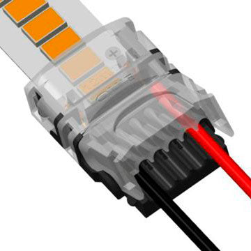 Snabbkoppling för förlängning av 10 mm breda LED-remsor med 240 led/m med kablar. Genomskinligt lock minskar mörka fläckar vid skarvarna. Lämplig för bland annat dessa remsor: 19,2 W/m 24V CRI>90 240 led/m -1300 lm/m och 19,2 W/m 24V CRI>80 240 led/m -1750 lm/m