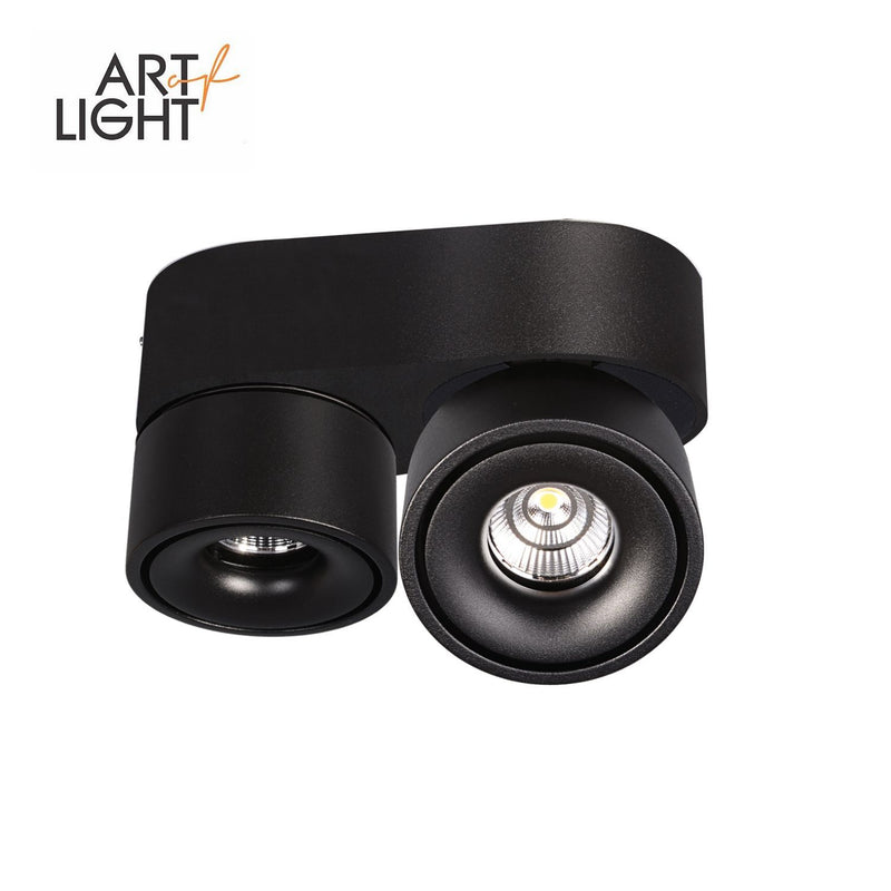 Utanpåliggande, modern och snygg svart rund LAHTI MINI LED-taklampa med 2 x 9W effekt - total ljuseffekt på 1050 lm, färgtemperatur varmvit 3000K och hög färgåtergivning CRI>90. Lampans två separata lampor kan vridas 90° i sidled, så att du kan belysa väggen med lamporna eller i vilken riktning du vill eller hålla lamporna i grundläget för att lysa direkt nedåt. Tillverkad helt i aluminium, högkvalitativa Philips LED-dioder.