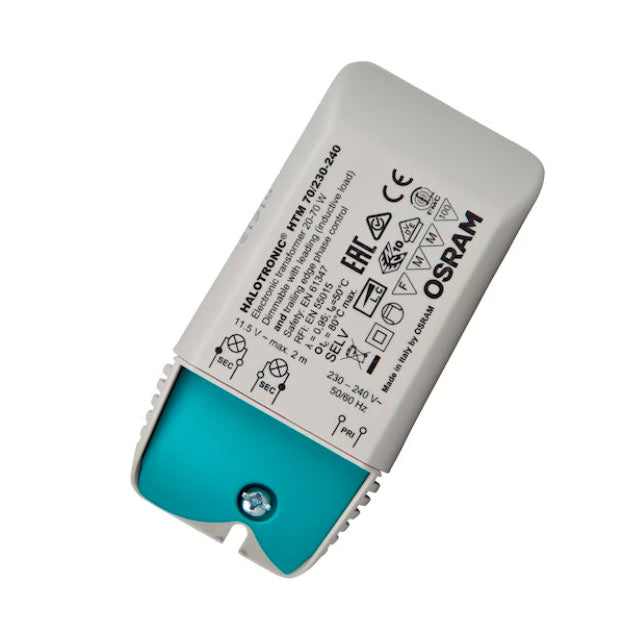 HALOTRONIC MOUSE elektronisk transformator. Tack vare sin speciella design är den lämplig för låga undertak med smala ljusöppningar (min. hål-Ø 55 mm, höjd 60 mm). Elektroniskt återställbara skydd mot kortslutning, överbelastning och överhettning. Justerbar med både stigande regulatorer (för induktiva laster) och fallande regulatorer.