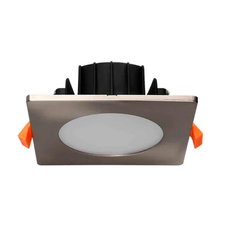 Mycket mångsidig infälld fyrkantig LED-downlight i borstat stål på 8 W för inomhusbruk, även lämplig för badrum. Triac-dimbar. Tre ljusfärgsalternativ: 3000K varmvitt ljus, 4000K neutralt ljus och 5000K kallt ljus som kan väljas från lampans baksida. Lampan består av två delar - grundlampan och ett lättmonterat fyrkantigt lock av borstat stål.