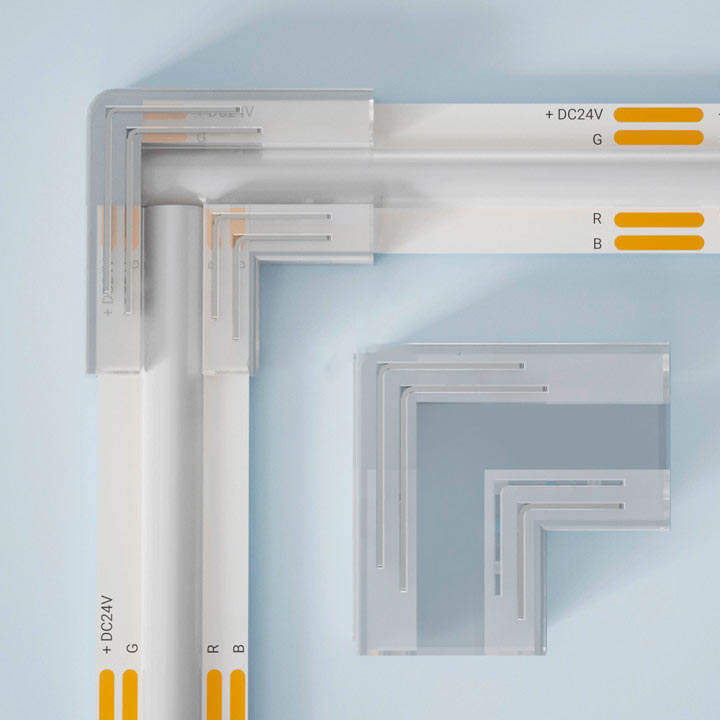 En kompakt snabbkoppling som kan användas för att göra en hörnanslutning till 10 mm breda punktlösa flerfärgade RGB COB LED-remsor. Kompatibel med 16,8 W/m 24V RGB LED-remsor för denna kontakt.