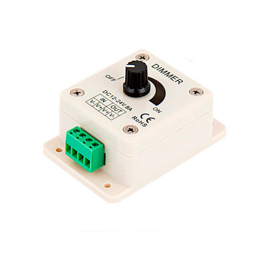 Inbyggd PWM-dimmer med rullknapp, lämplig för dimning av 12V och 24V LED-remsor. Dimmern fungerar med 12V DC, men även 24V DC. 1 x 8A kanal för LED-remsa. Fungerar med alla enfärgade LED-remsor.