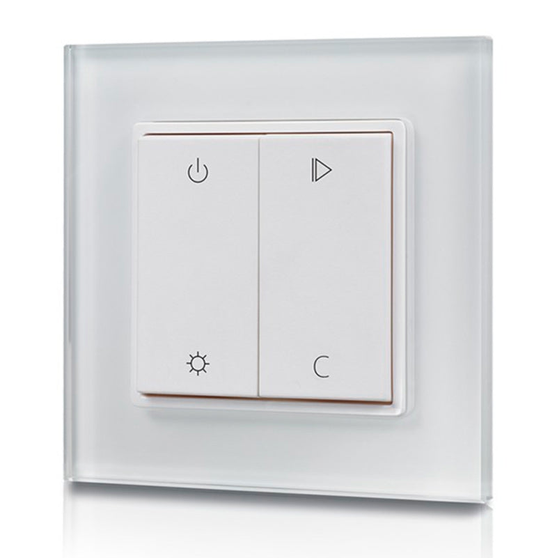 Tryckknappskontrollen fungerar som en vanlig på/av-brytare med egna knappar och ett långt tryck dimmar och förstärker ljuset. Separata knappar även för färgbyte (7 olika färgalternativ direkt genom att trycka kort och ett långt tryck skjuter långsamt färgerna, så att du kan stoppa vid en lämplig punkt). En knapp även för förprogrammerade färgbytesprogram, från vilka du startar, byter program och stänger av det. Färg vit. Monteras på en vägg eller möbel, kan även installeras direkt i de eldosor som används i Finland. Enkel att eftermontera, eftersom det inte finns någon kabeldragning till kontrollenheten alls och den drivs av batteri. Förutom kontrollenheten kan färgerna på listen justeras från en smartphone om en RF WiFi-omvandlare är installerad i samma system.