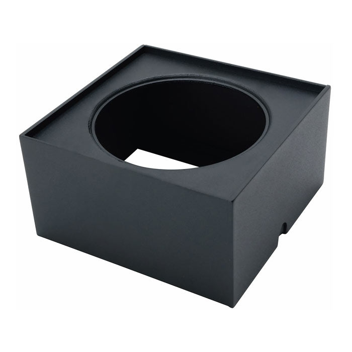 Svart monteringsram i ett stycke för LED-lampor för utanpåliggande montering. Storlek 12,5 cm x 12,5 cm och höjd 7 cm.
